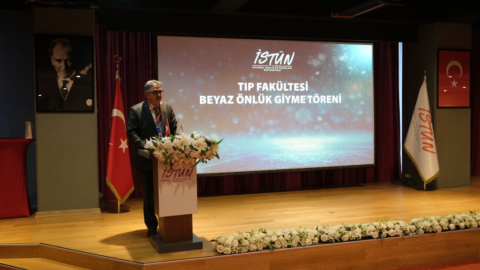 Saygı duruşu ve İstiklal Marşı’nın ardından başlayan törende İstanbul Sağlık ve Teknoloji Üniversitesi Rektörü Prof. Dr. Buğra Özen, rektör yardımcıları ve davetli konuklar öğrencilere hitap etti. Rektör Prof. Dr. Buğra Özen konuşmasında üniversitenin eğitim vizyonuna ve hekimlik mesleğinin taşıdığı sorumluluğa değinerek genç hekim adaylarına önemli mesajlar verdi. Hekimliğin yalnızca bilimsel bilgiyle değil, aynı zamanda güçlü etik değerlerle şekillendiğini vurgulayan Prof. Dr. Özen, konuşmasını Gazi Mustafa Kemal Atatürk’ün “Beni Türk hekimlerine emanet ediniz.” sözüyle tamamladı.